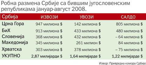 Политика, 19.10.2008. Србија је раширених руку прихватила капитал и робу бивших југословенских република не зато што живи на крилима југоносталгије, већ зато што је у отварању тржишта препознала свој интерес. Међутим, њене инвестиције у суседству, са ретким изузецима, своде се на ниво статистичке грешке. Да ли Словенија, Хрватска и Македонија негују економски патриотизам или наши привредници нису довољно агресивни, на снази је тек тихи бојкот новцаиз Србије. Са друге стране, парола „купујмо домаће”, није могла да се прими на тлу Црне Горе, Босне и Херцеговине и Македоније, јер ове земље увозе највише производа из Србије и трајно су везане за наше тржиште.