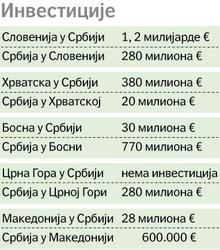 ![]() Ни Македонци не могу без српског „смедеревца”, јунеће шницле и још много тога, па нас издашно и плаћају, али зато не воле да им се српски капиталисти шире унаоколо. Сарадња јесте прилично скромна, признаје Дејан Јововић, саветник за регионалну сарадњу у Привредној комори Србије. Ту констатацију потврђује чињеницом да су наше фирме у Македонији инвестирале тек око 28 милиона евра и то махом у куповину бивших представништва. Ни Македонци се не могу похвалити завидним резултатима у Србији. Они су код нас уложили тек 600.000 евра. У целој причи око натегнутих српско-македонских инвестиција, својеврстан парадокс изазива управо податак да Србија са Македонијом има суфицит у робној размени од око 84 милиона долара, која на тај начин представља битног економског партнера за Србију. У ову државу смо извезли 345 милиона долара, што је за 28 процената више у односу на исти период минуле године. Нажалост, нису само односи са Македонијом обојени парадоксима и тихим бојкотом. Без обзира на то што Словенци упорно тврде да је њихово тржиште слободно и да за све важе исти условитек ове године две српске компаније су успеле да одшкрину врата те земље, захваљујући којима Србија књижи 280 милиона евра инвестиција. Српске легуре алуминијума, производи црне металургије и уље соје, ако је за утеху, далеко лакше се пробијају до словеначких потрошача него наши бизнисмени. Наш извоз се мери сумом од 368 милиона долара. И на овом пољу словеначка роба ипак има бољу прођу код нас, да ли због агресивнијег наступа или зато што не можемо да живимо без „Кркиних” лекова, „Горењевих” машина за веш, аутомобилских гума и новинске хартије, тек статистика говори да увозимо робу у вредности од 432 милиона долара. Чак и у робној размени Србија је на губитку – 64 милиона долара. Према мишљењу Дејана Јововића, непостојање споразума о слободној трговини кључни је разлог што промет робе и ниво инвестиција нису онакви какви бисмо желели да буду. Он подсећа да је тај документ својевремено био парафиран, али га је наша држава повукла због лошег односа словеначке државе према нашим инвеститорима. Тиме нам је, каже, прилично ограничен продор на то тржиште. Ако је тако, онда би требало са Хрватском, чланицом Цефте, да тргујемо на велико. То ипак не чинимо. Управо у робној размени са овом земљом бележимо највеће губитке, међу потписницама споразума о слободном промету робе, услуга. Негативни салдо достиже 75 милиона долара. На тамошње тржиште пласирамо шећерну репу, етилен, производе црне металургије у вредности од 303 милиона долара, а од њих увозимо уље лана, ђубриво, цемент, што укупно износи 378 милиона долара. Затвореност овог тржишта видљива је на сваком кораку. Иако тамошњи званичници уверавају да на њиховом тржишту нема правних препрека за иностране компаније, па тиме ни за фирме из Србије, у тој комуникацији нешто не штима. Жељко Митровић, власник „Пинк медија групе” недавно је узбуркао јавност када је најавио да ће Хрватску обојити у ружичасто. У тамошњим медијима осванула је вест да је српски медијски магнат купио хрватску ТВ станицу „Нет” за 2,5 милиона евра. Убрзо је уследио деманти из Београда, са образложењем да јесамопреговарано о томе. Да „Свислајон”, Родољуба Драшковића није пре три месеца за 20 милиона евра пазарио фабрику за прераду воћа и поврћа и производњу бисквита „Еврофу