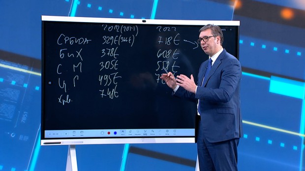Председник изјавио је да је у односу на 2012, Србија ове године имала највећи раст плата у региону, у односу на Босну и Херцеговину, Северну Македонију, Црну Гору и Хрватску. "Постајемо први пут први, са најнижом стопом јавног дуга и незапослености, иако смо делили треће и четврто место пре осам година у региону. После нас најнижу стопу незапослености има Албанија", рекао је Вучић. Очекују, како каже, да просечна плата у марту буде 750 евра, а до краја године 820 евра. "До краја 2025. године, оно што људе занима, очекујемо да просечна плата буде хиљада евра, уз инфлацију која није увезена", навео је председник. Србија се до сада провукла кроз "иглене уши", али да не знам колико ће моћи даље "Кажу други да Запад овде у Србији има своје интересе, да се неће повући. А из Русије се повукли у седам дана, све своје компаније и банке су склонили. БАСФ, највећи хемијски гигант у свету отпушта хиљаде људи. Све су то у стању да ураде зато што су у рату, а нама као неће да ураде? Пошто смо много важни, је л' хоћете да се коцкамо? Ја нисам коцкар, секирам се за сваки динар и за сваког човека у овој земљи. Нећу да се бавим тиме да ли Запад блефира или не", поручио је председник. О изборима на КиМ Упитан да ли је у Бриселу било речи о ванредним изборима на Косову и Метохији, каже да није и да не зна да ли ће Приштина да спроведе изборе.