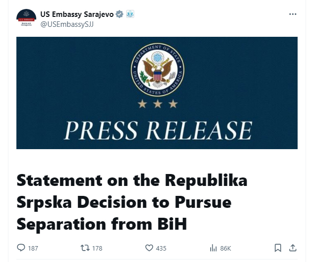 Амбасада САД у Сарајеву: Сецесија РС не значи њену независност нити крај БиХ - већ крај РС. Устав БиХ не даје ентитетима право на „раздруживање“ |