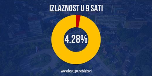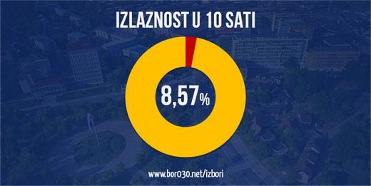 Излазност на данашњим изборима у Бору до 9 часова је 4,28%. Своје право гласа је до сада искористило 1850 грађана са правом гласа, што је за 1,91% мање него прошле године, на председничким изборима. Ипак, оваква излазност је већа него у Београду, која износи 3,9%. 09.15 Владимир Стојичевић искористио право гласа