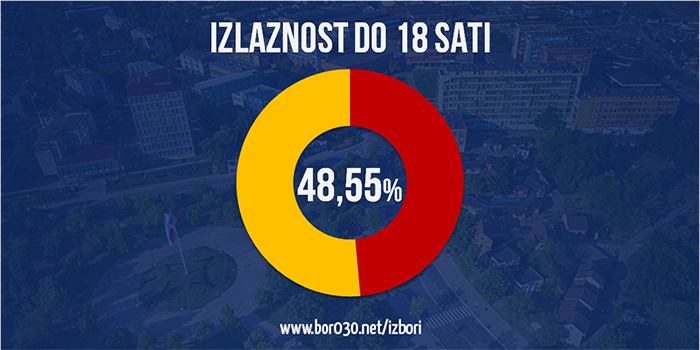 Нешто после 19 часова Благоје Спасковски, генерални директор Рударско-топионичарског басена (РТБ) Бор и повереник ОО СНС Бор гласао је на бирачком месту бр. 20, у месној заједници „Напредак“ у Бору 2. 19.20 Излазност до 19 часова је 52,8% До 19 часова је изашло 52,8% бирача, односно 22.859 грађана. Још нешто мање од сат времена остало је до завршетка гласања на 47 бирачких места на којима је право гласања имало 43.261 бирача. 18.30 48,55% гласача до 18 часова