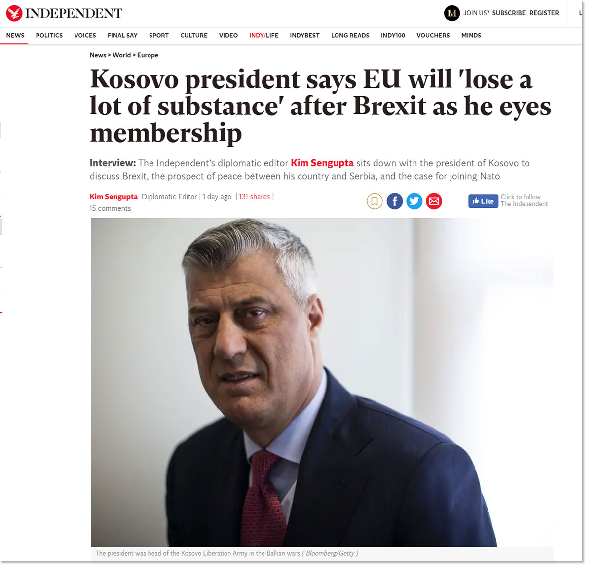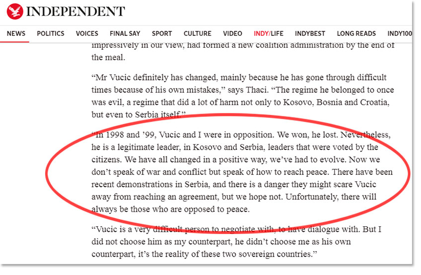 Тачи каже и да се Вучић доста променио од када се први пут појавио у политици: "Режим коме је некада припадао био је зао, режим који је нанео много штете не само Косову, Босни и Хрватској, већ и самој Србији". "Индипендент", међутим, примећује да се Тачи суочава са сопственим проблемима јер Специјални суд, основан 2017. године у Хагу истражује наводе да су он и припадници такозване ОВК починили ратне злочине, а на то Тачи каже да се не ничега не боји: "Нећемо бежати, нећемо се стидети, суочићемо се са тим и уверен сам да ћемо га превазићи достојанствено и са интегритетом. Увек ће бити гласова који ће покушавати да оцрне или оптуже Косово, баце љагу на Косово и мене лично. Верујем у правду. Оно што не би требало да дозволимо да се деси јесте да се историја поново напише".