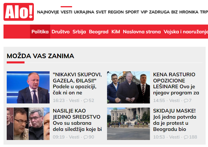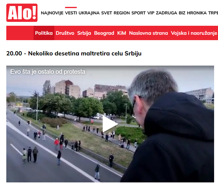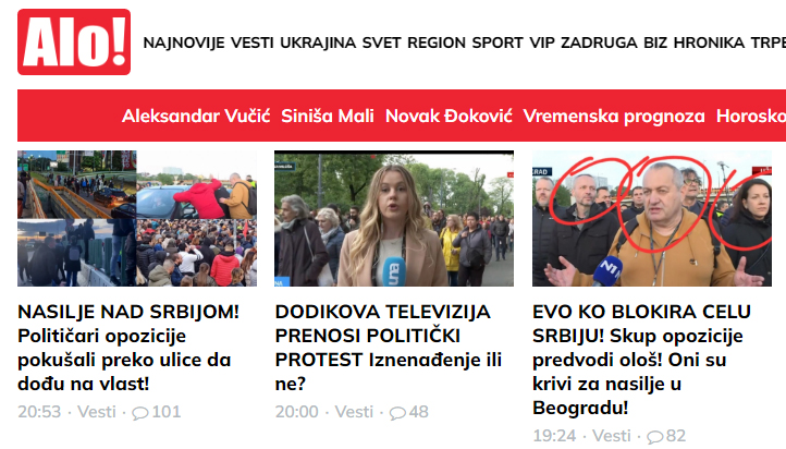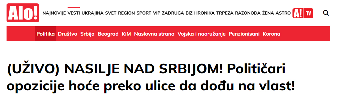 Из исте кухиње: Таблоид "Вечерње новости" пресликао наслове таблида "Ало" 18.51 - Инциденти на протесту опозиције Грађани који су се нашли у центру Београда нашли су се на удару присталица опозиције. 18.34 - Пијани лелујају по улицама На политичком скупу испред Народне скупштине више присталица опозиције донело је алкохол, а неки су већ стигли и да се напију. Протест који су најавили под плаштом борбе против насиља, претвара се у теревенку на отвореном.