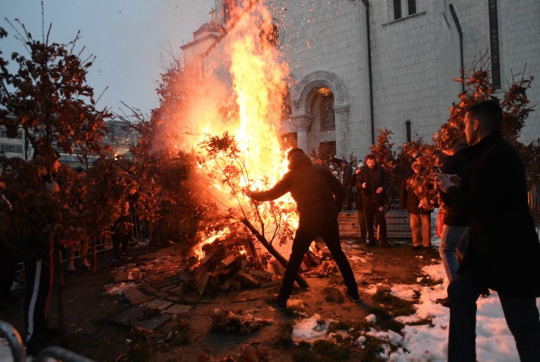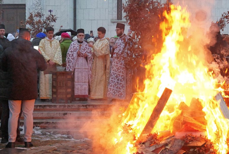 Испред Храма Светог Саве у Београду на Бадње вече традиционално је запаљен бадњак у присуству великог броја верника.