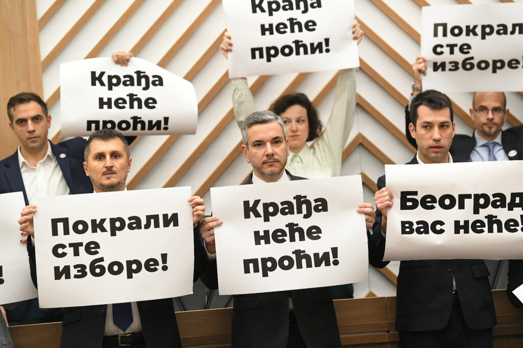 Конститутивна седница Скупштине Београда одложена за 3. март. Одборници СПН истакли транспаренте „Крађа неће проћи“, „Покрали сте изборе“ и „Београд вас неће“ |