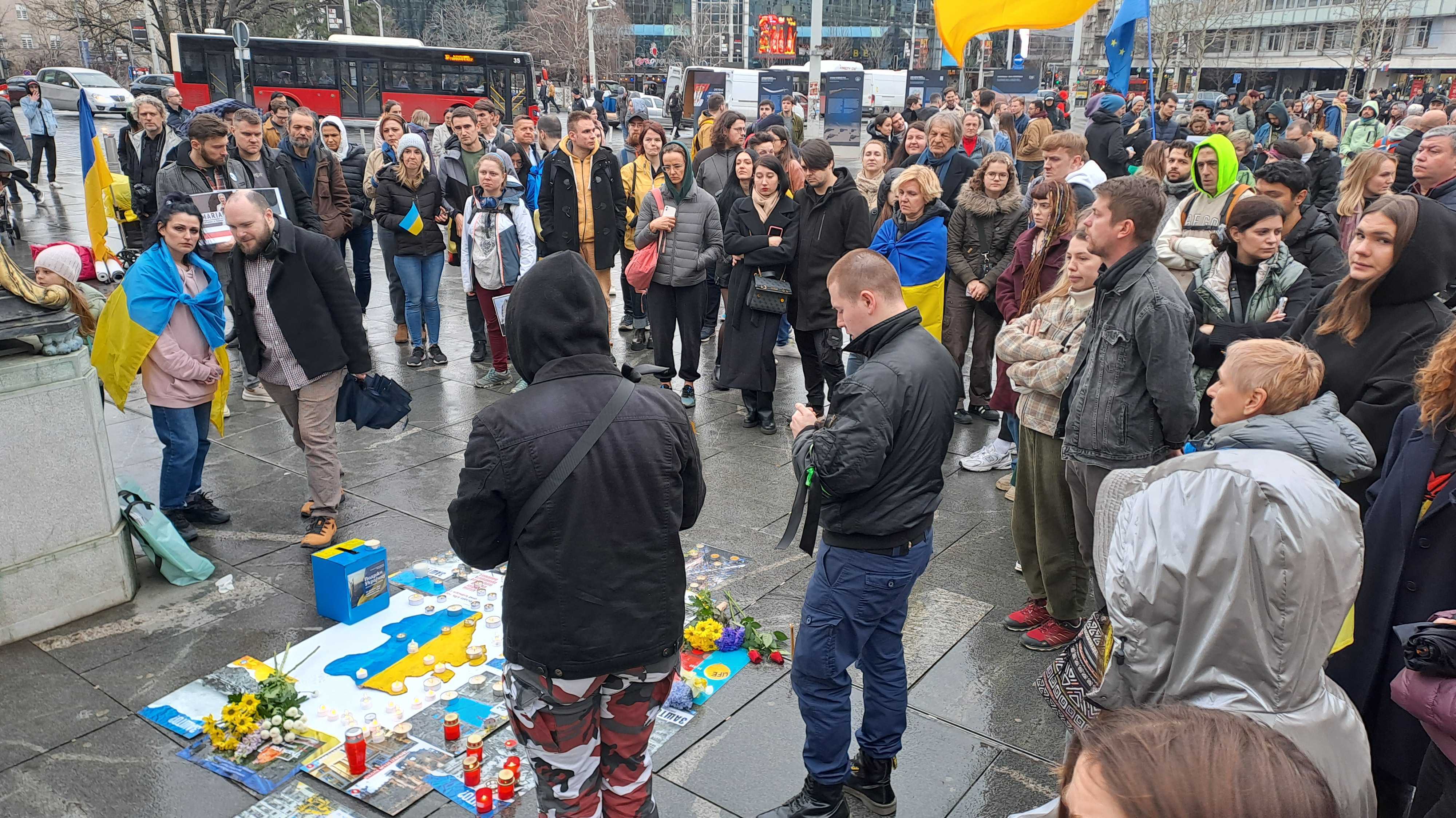 Више стотина људи носи украјинске и ЕУ заставе, као и транспаренте „Стоп злу, стоп рату“.