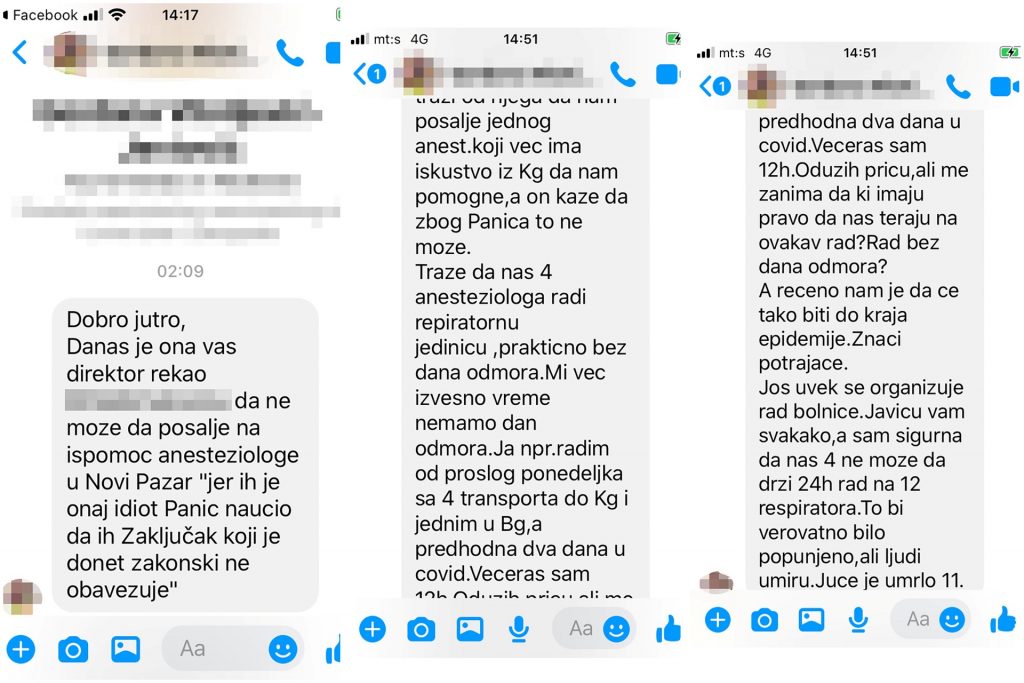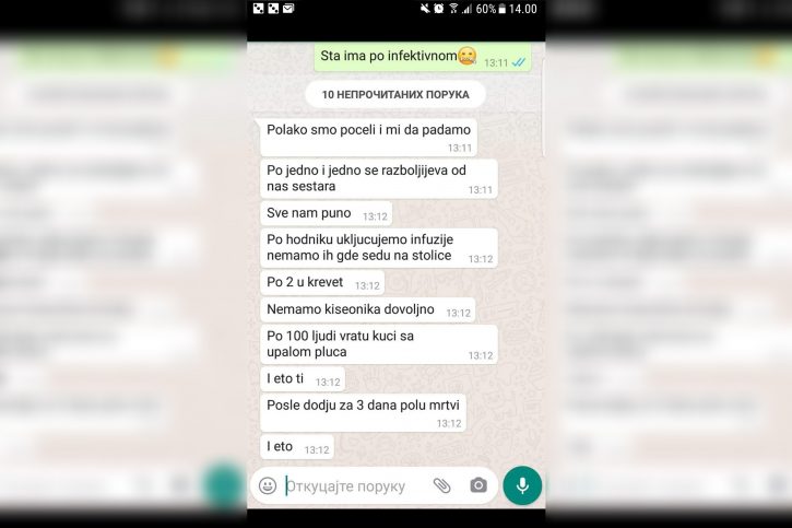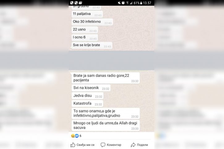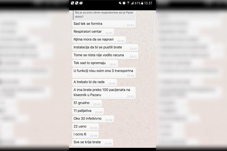 Капацитети болнице су одавно пребукирани, пацијенти леже на ходницима, медицинско особље на ивици снаге преклиње за помоћ … а држава ћути. Док се у Новом Пазару набављају џакови за премунуле, респиратори не раде, а преко 100 људи се налази у критичном стању, држава не шаље никакву помоћ, а врхушка Кризног штаба на челу са др Даријом Кисић, се налази на Златибору на семинару посвећеном ЦОВИД 19. Градски штаб расписао је хитну набавку опреме, а на списку су 20 лимених сандука и 200 џакова за посмртне остатке. Упркос тврдњама лекара да је број смртних случајева драстично већи, те да им је само у једном дану преминуло 11 људи, ови подаци се не могу чути од Кризног штаба. Каква је реална ситуација у Новом Пазару говоре бројне поруке сестара и лекара Опште болнице у овом граду. Идентитет свих саговорника је познат редакцији, а њихове речи и поруке објављујемо у целости и уз личну сагласност. “Траже да нас четири анестезиолога ради целу респираторну јединицу, практично без дана одмора. Нас четворо не може да држи рад 24 часа на 12 респиратора. То би било попуњено, а људи умиру. Јуче је умрло 11”, каже докрорка из пазарске болнице, напомињући да је у Нови Пазар као испомоћ влада послала свега два анестезиолога из Крагујевца. “Полако смо почели и ми да падамо. Једно по једно се разбољева и од нас сестара. Немамо довољно кисеоника, по 100 људи врате кући са упалом плућа … Све нам је пуно, по двоје у кревету, укључујемо инфузију по ходнику …” , речи су једне од медицинских сестара.