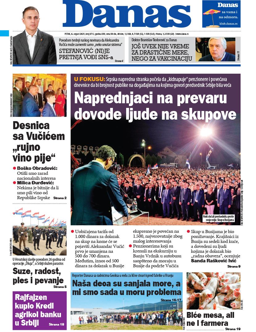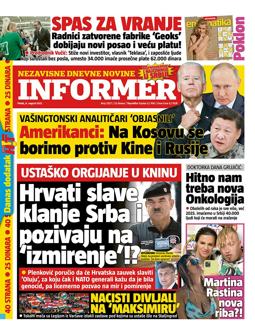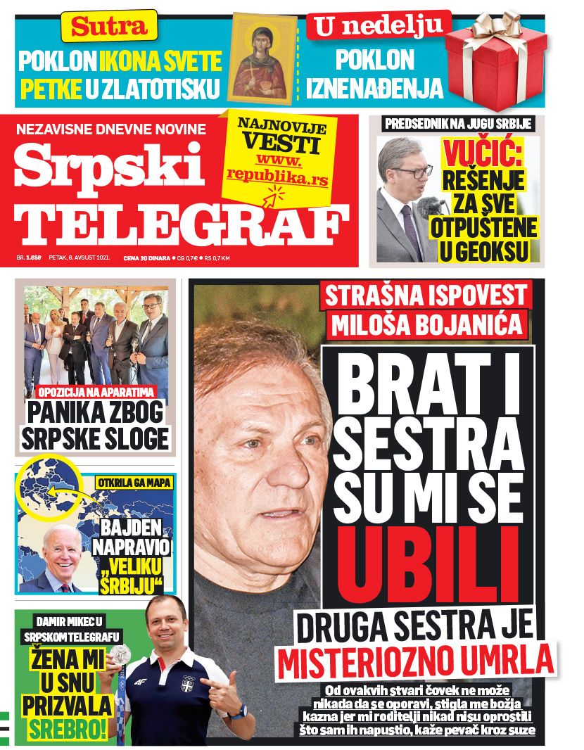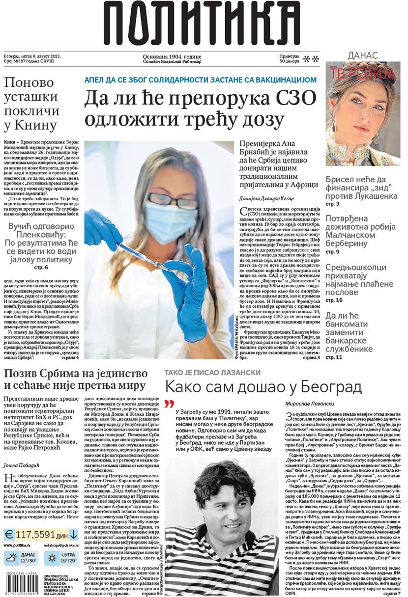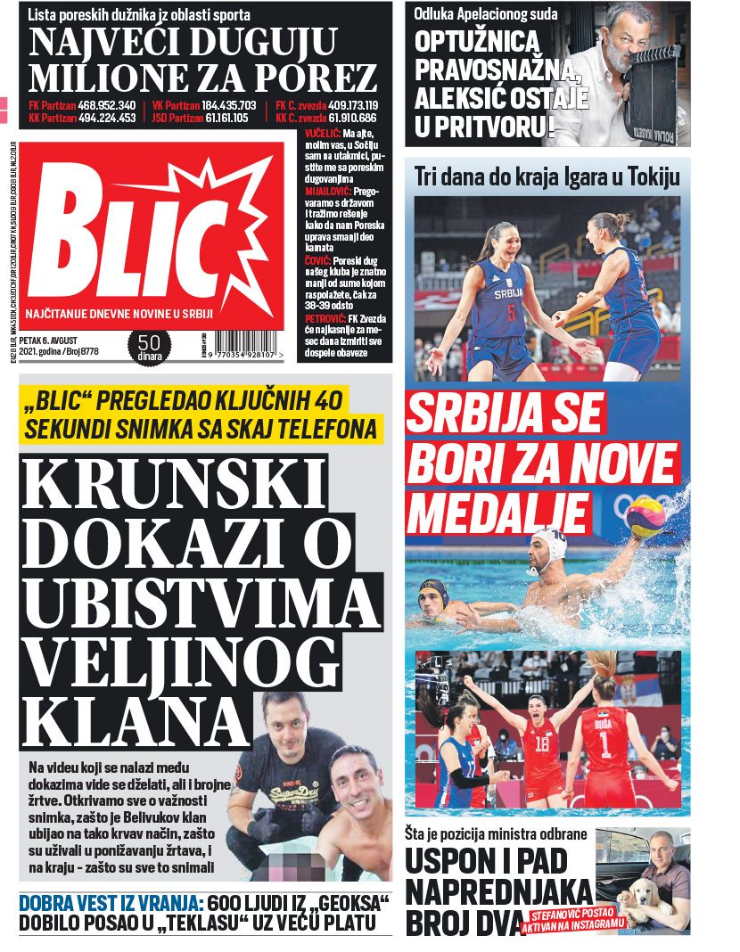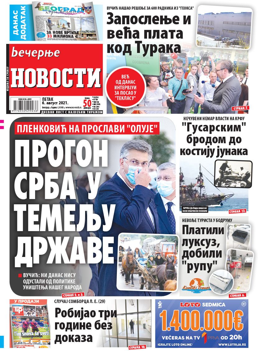 Почетна страна > Хроника > Насловне стране српске штампе 6. августа 2021. године