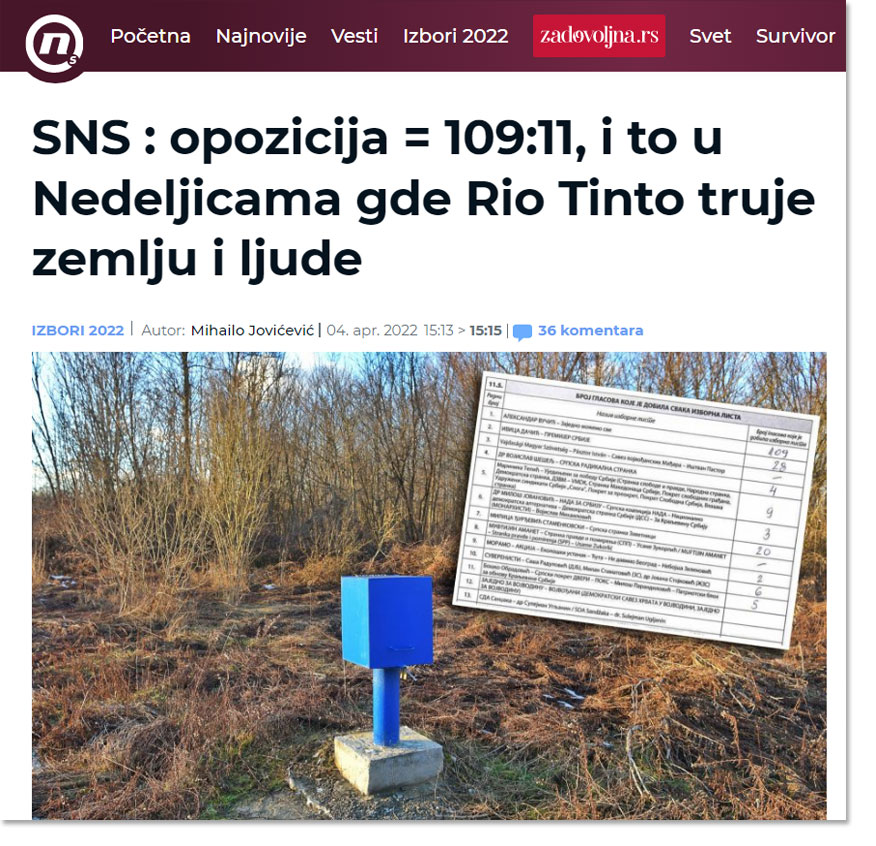 Нова.рс Сумњиви записник са гласања у Недељицама, где Рио Тинто трује земљу и људе - СНС : опозиција = 109:11 |