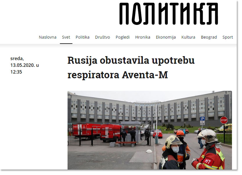 Руски респиратори су одлични Одбацује и критике да не ваљају руски респиратори, који су инсталирани у Батајници, те додаје да су му рекли да је реч о одличним апаратима. "Зар стварно мислите да је могуће да неко тако води земљу, да критикује сваког зато што му се може, ко ништа не ради и никад нигде ничим није допринео", упитао је Вучић.